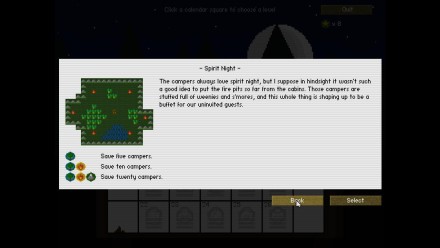 Taigi, kaip jau minėjau, kiekvieną mėnesio dieną atstoja vis kitoks lygis. Pirmadienį tai gali būti miškelis, antradienį pievos, trečiadienį ir to, ir ano, o ketvirtadienį stovyklavietę tikėtinai aplankys inspektorius, tad jį reiks palydėti. Įdomu tai, jog lygius galima žaisti ne iš eilės. Aišku, tolimesni lygiai yra atrakinami, bet pačioje pradžioje galima pradėti kad ir nuo trečiojo lygio.