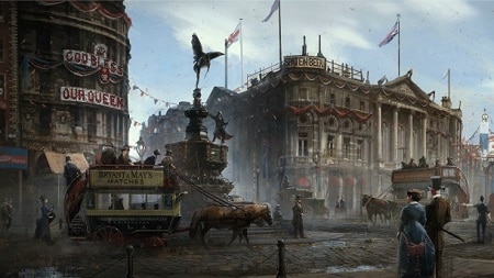 Pats miestas „Syndicate“ yra kompaktiškas, patogus tiek judėjimo, tiek ir daiktų rinkimo prasme. Ar tai – Viktorijos laikų Londonas? Tikrai taip. Nuo daugybės suodinų kaminų iki rūko, užgulančio purvinas pramoninės revoliucijos ištepliotas gatves – tai miestas, į kurį norisi patekti bei apžiūrėti savo akimis. Taip pat žaidimo įvykiai vyksta rudenį, o tai leis pamatyti ir puikią Londone bei plačios rudens spalvų paletės dermę. Šiame mieste nėra arklių, bet yra karietos su arkliais, kuriomis galima netgi draguoti plačiomis Londono gatvėmis… Ar tai tikroviška? Ne. Ar tai griauna žaidimo atmosferą? Irgi ne, nes po „Assassin`s Creed: Revelations“ dviejų veikėjų muštynių ore, krentant iš bala žino kokio aukščio, karietų dragas paprasčiausiai nebestebina. Tiesa, be karietų žaidėjo inventorių papildė specialus įtaisas, leidžiantis iššauti virvę ir taip persikelti į norimą vietą. Šiuo moderniu ir labai patogiu būdu manevravimas po miestą tampa greitesnis bei kiek įdomesnis nei įprasta. Matyt, šis prietaisas (ar kokia nors jo alternatyva) taps nauja sudedamąja AC serijos dalimi.