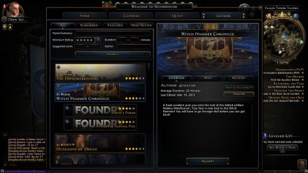 Na, o unikalioji „Foundry“ sistema veikia, kaip ir turėtų veikti. Nežinau, ar tuos požemius kūrė kas nors iš pačios žaidimo kūrėjo komandos, ar tai buvo pavieniai žaidėjai, bet iš karto pasijautė kitokia atmosfera. Svarbiausia tai, jog besikalbant su ten stovėjusiu NPC, aš galėjau pasirinkti vieną iš kelių atsakymų ir taip pameluoti. Šie, žaidėjų kurti nuotykiai, atlieka tokią pačią funkciją, kaip ir paprastos misijos – juos sėkmingai pabaigus, gaunami patirties taškai. Taip pat patiko galimybė reitinguoti nuotykius. Taip, laikui bėgant, „atsisijos“ patys geriausi ir verčiausi dėmesio.