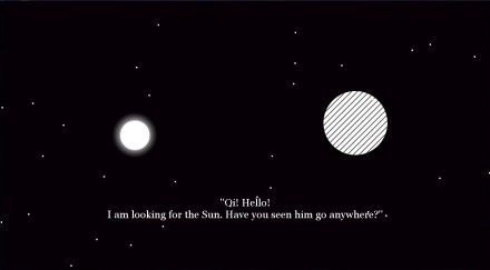 Klydau. Pasirodo, tas baltas rutulys yra pats Mėnulis, turintis asmenybę ir tikslą surasti Saulę. Pakeliui Mėnulis sutiks žmonių nukankintą Žemę (paliečiama miškų kirtimo problema?), savimylą Venerą ir paranojiką Merkurijų. Galiausiai jam paaiškės, kad Saulė niekur nedingo, o tiesiog nusileido ir jai jau pats laikas vėl patekėti, todėl teks grįžti atgal.