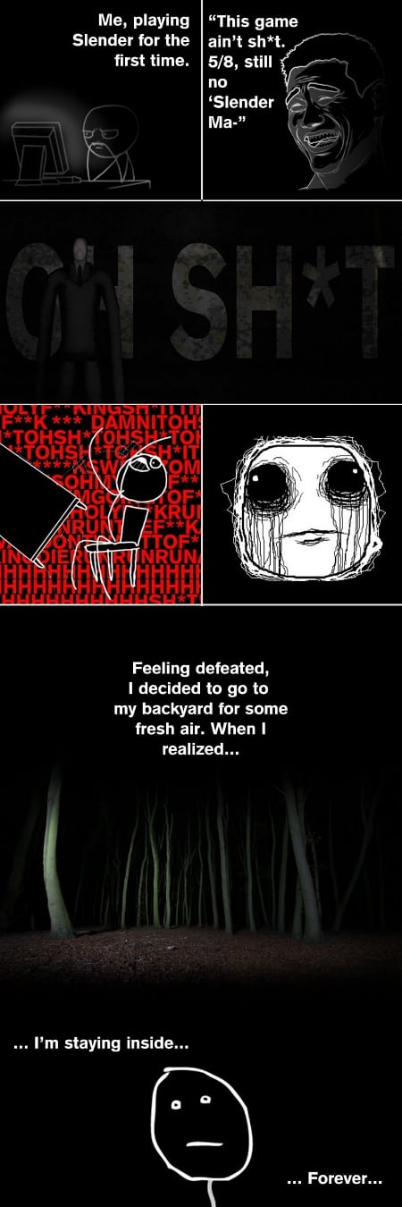Hmmm, visgi tai tiesa… vienintelis budas išvengt Slenderio – begti ir nežiureti atgal. Jokios improvizacijos. Jokios taktikos, tik beg kiek gali.