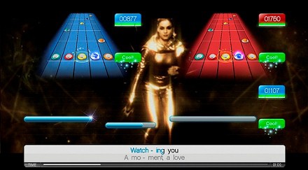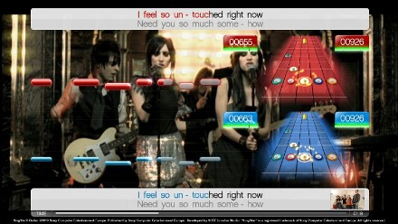 Dar vienas erzinantis dalykas susijęs su galimybe groti gitara – natų atvaizdavimas ekrane. Žaidžiant vienam problemų nekyla, tačiau nusprendus dar ir dainuoti, natų „greitkelis“ kaip mat sumažėja, o jei žaisite su draugu dviem gitarom, reikės atsisėst prieš pat televizorių. Kaip žaidimo ekranas atrodo žaidžiant keturiems žmonėms – dviems su mikrofonais ir dviems su gitaromis – manau nesunku įsivaizduot. Visa tai apibūdinama vienu žodžiu – blogai. Vakarėlių žaidimas diskomforto kelti neturėtų, tačiau čia tas kuo puikiausiai daroma. Be abejo, atjungus gitaras ekranas lieka erdvus, žodžiai gerai matomi, bet juk žaidimas vadinasi Singstar Guitar, tad jį įsigiję gitarų atjungti mes tikrai nenorime…