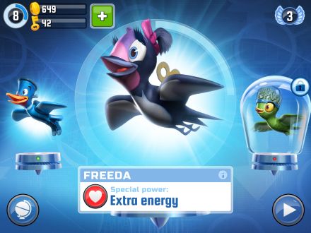 Tuomet turime veikėjų tobulinimą, kainuojantį monetas. Nors pirmieji tobulinimai yra tikrai pigūs, tolimesni kainuoja tūkstančius. Palyginimui, sėkmingesnis skrydis suteikia apie 600+ monetų, su ta sąlyga, kad lygio gale pažiūrėsime reklamą ir gausime monetų bonusą. Atrodytų, 600 – visai nieko skaičius, tad veikėjus ištobulinti netruksime. Nei velnio! Kiekvieną kartą mirę išeikvosime vieną sparną (viso yra 5). Šie sparnai užsikrauna trimis atvejais: pakilus lygiu, palaukiant pusvalandį (vienas sparnas per pusvalandį), ar visi 5 už 0,99 eurų. Tad sėdėdami kokiame autobuse vis tiek būsime priversti padaryti pertrauką nuo žaidimo.
