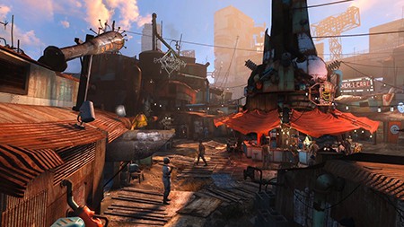 Tiesa pats fallout 4 žaismas šiek tiek priešgyniauja tiek pasakojimui, tiek bendrai pasaulio atmosferai. Vieną akimirką šaukiame ant aplinkinių ieškodami savo prarastojo sunaus, reikalui esant griebiamės kankinimų, o jau po akimirkos statome pašiūres ir rūpinamės pabėgėliais. Pabėgėliai post apokaliptiniame pasaulyje turi labai panašių norų, kaip ir šiandien, tad privalome kurti darbo vietas, rausti šulinius ir rūpintis moderniausiomis esamomis ryšio priemonėmis. Tiesa postapokaliptiniai pabėgėliai labai gerai jaučiasi, jei pasaulį nuo jų atitveri siena, tad norint užtikrinti jų saugumą ir tai teks padaryti. Dėl šių priežasčių kiekvienas žaidime esantis daiktas gali būti sunaikintas ir paverstas naujų daiktų gamybai reikalingais komponentais. Tiesą pasakius vien Fallout 4 statybų sistema gali būti atskiru žaidimu, nes joje visko tiek daug, kad neretai užsimirštame turintys visą tyrinėjamą pasaulį aplinkui.