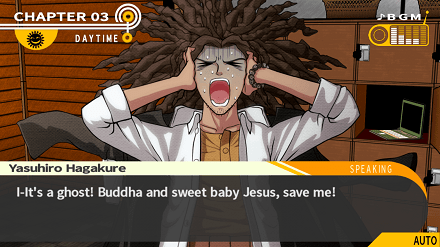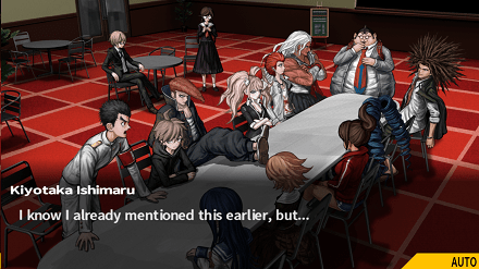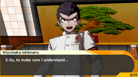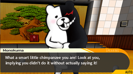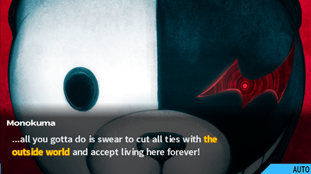 Ir visai netrukus prisistato pagrindinis šio žaidimo piktadarys Monokuma, kurį paprastumo vardan toliau vadinsiu tiesiog „Meškiu“. Jis visai klasei praneša, kad jie gimnazijoje pasiliks visam gyvenimui, tačiau yra vienas dalykas, kuris leis jiems išeiti į laisvę. Tad Meškis pasako kažką panašaus į: