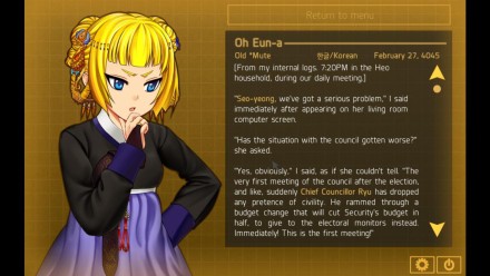 Prieš pradedant, galima atlikti kelis nustatymus: pasirinkti veiksmo metus, kaip į mus bus kreipiamasi, kokio būdo bus pasirinktoji AI bei kurią iš jų „instaliuosime. Antrąją, vardu *Hyum-Ae, galima pasirinktinai „customizint“ – parinkt vieną iš kelių aprangų.