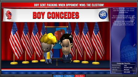Tiesą sakant, šitas žaidimas labai primena 2008-ųjų versiją (taip, buvo dar ir tokia), kuri praktiškai niekuo nesiskiria nuo šiemetinės versijos, todėl nenuostabu, kad ir kainą turime daugmaž atitinkamą – 8 eurus. Kaip galbūt pastebėjote pristatomajame filmuke, visi mūsų JAV herojai turi komiškai išpūstas galvas ir šitaip, galbūt, stengiamasi komiškiau pažvelgti į, kaip daugelis apžvalgininkų sako, svarbiausio laisvojo pasaulio vadovo rinkimus. Skambu. Žaidime rasime bene visus demokratus ir respublikonus, pradedant, mano nuomone, klaikiu Al Gore, baigiant 100 JAV dolerių kupiūromis laužą užkuriančiu Donald‘u Trump‘u. Gaila, kad nėra nepriklausomų kandidatų, bet apsimeskime, kad tai mums ne problema.