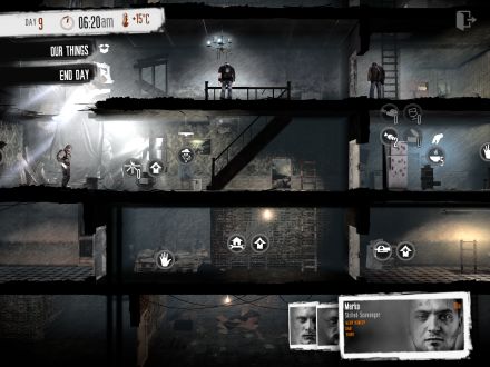 Kaip jau minėjau, „This War of Mine“ yra tiesiog gimęs būti žaidžiamu planšetėse, mat viską, be jokių problemų, galime valdyti dviem nykščiais.