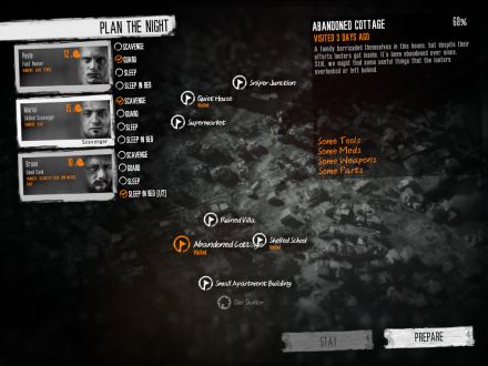 Nors pradinėms reikmėms skirtų resursų rasime savo namo viduje, jų neišvengiamai reikės daugiau. O tam kiekvieną naktį (nors tai neprivaloma, galime leisti veikėjui pamiegoti ir pan) galėsime leisti vieną veikėją rinkti medžiagų. Ir, aišku, jos arba bus labai ribotos, arba jų bus tiek, kad veikėjui nereiks toli keliauti ir jų ieškoti, arba susitiksime su mūsų atžvilgiu nedraugiškai nusiteikusiais NPCs, kurie arba paprašys išeiti, arba bandytis nudaigoti. Žinoma, vieni veikėjai tai darys geriau už kitus. Štai, mano antrojo žaidimo metu pasisekė gauti veikėją, kuprinėje turintį net 15 vietų (kuomet kiti veikėjai jų turi po 10 – 12), taigi kas trečia naktis man praktiškai sutaupydavo vieną papildomą naktinę kelionę.