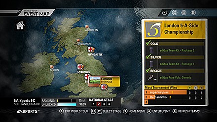 Pagrindinis „FIFA Street“ režimas vadinasi „World Tour“. Jame reikia susikurti komandą ir pradėti karjerą gatvės futbolo pasaulyje. Karjeros režimas stebėtinai trumpas. Jis padalintas į keturis etapus: regioninį, nacionalinį, žemyninį ir tarpžemyninį čempionatus. Paskutinių rungtynių finalinį švilpuką išgirdau po maždaug 15 valandų, praleistų įvairiuose karjeros turnyruose.