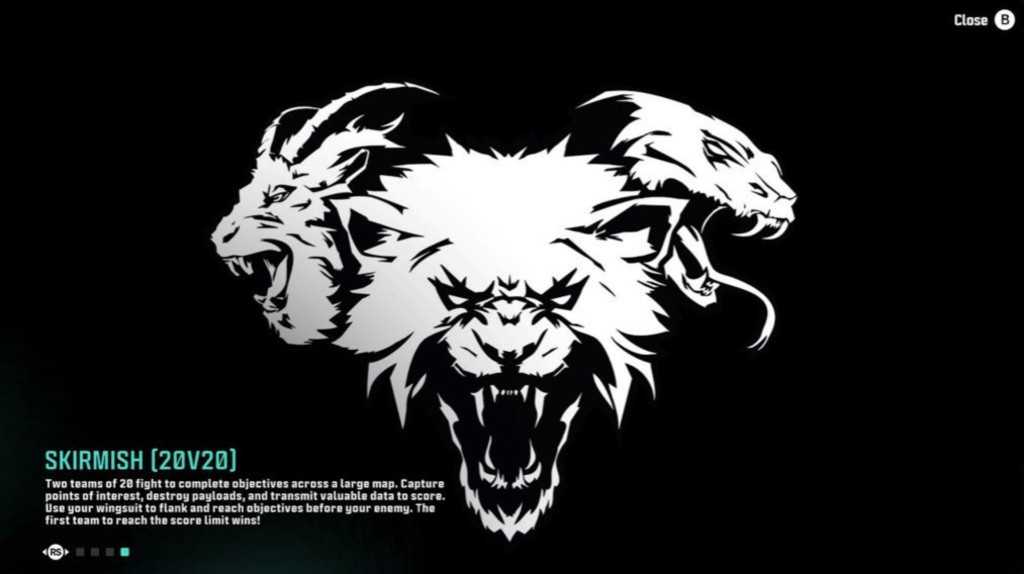Viena iš labiausiai intriguojančių naujovių – režimas Skirmish, kuriame dvi 20 žaidėjų komandos kausis dideliame žemėlapyje. Režimo aprašymas atskleidžia, kad pagrindinės užduotys apima strateginių taškų užėmimą, krovinio sunaikinimą ir duomenų perdavimą. Įdomiausia detalė – galimybė naudoti wingsuit: žaidėjai galės sklęsti ore, flankuoti priešo pozicijas ir greičiau pasiekti užduočių vietas. Komanda, pirmoji surinkusi reikiamą taškų kiekį, laimės.